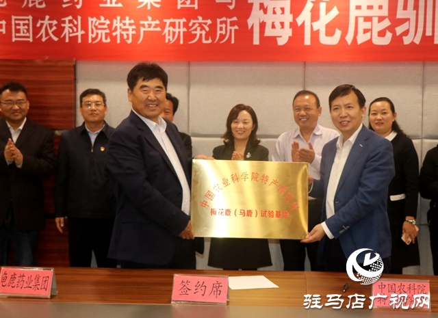 在与会领导与专家的见证下,龟鹿药业集团董事长王学生与中国农业科学院特产研究所所长李光玉签署技术合作协议,李光玉为“中国农科院特产研究所梅花鹿(马鹿)试验基地”授牌。今后双方将通过开展梅花鹿产业科学研究,在标准体系构建、成果转化、新产品研发、质量检测、产业技术等领域进行广泛合作。双方的签约对促进新蔡县梅花鹿(马鹿)养殖、产品研发、质量提高等方面具有十分重要的意义。